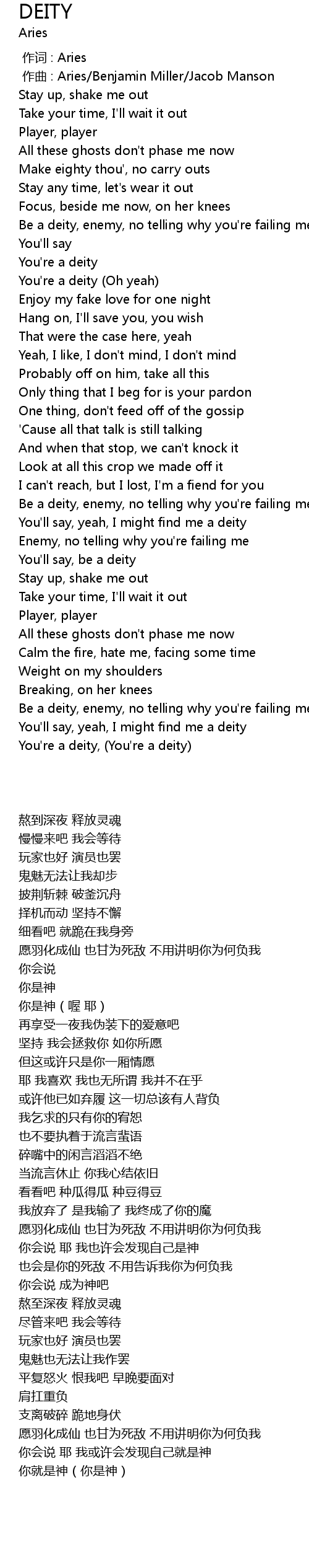 | [00:20.71] | Be a deity, enemy, no telling why you're failing me |