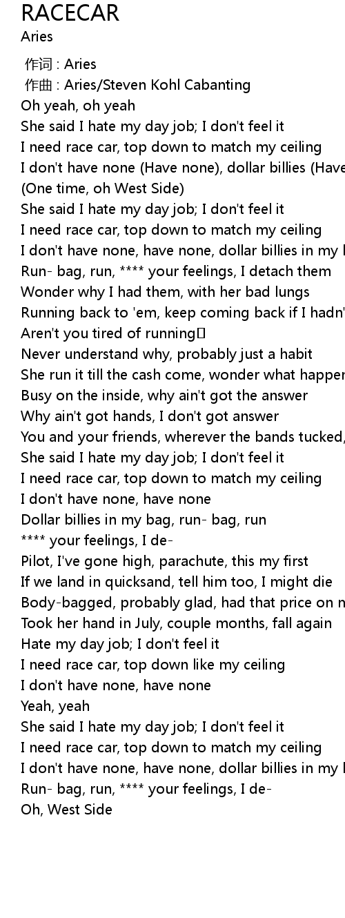 | [01:49.85] | I need race car, top down like my ceiling |