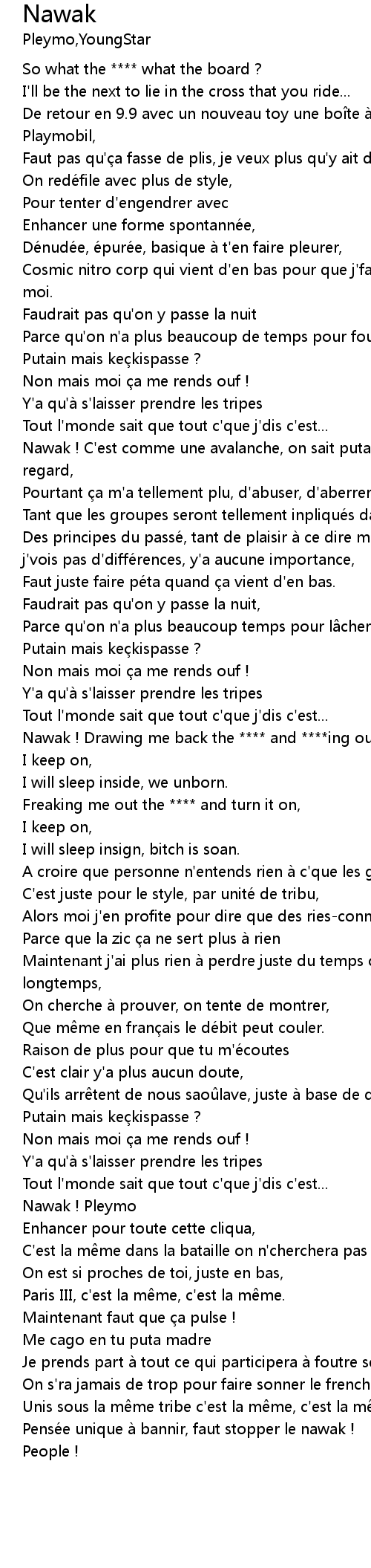 | Nawak ! Drawing me back the **** and ****ing out, | |