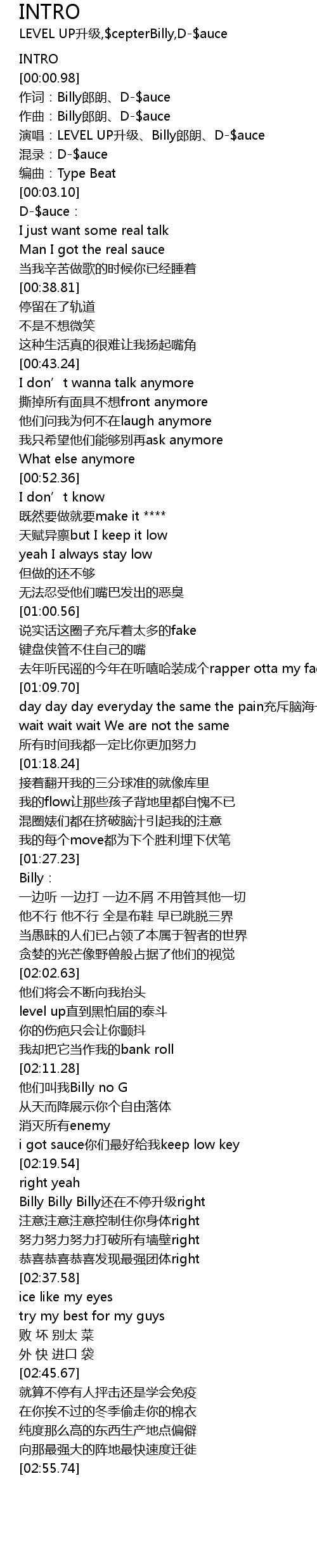 | [00:02.01] | yǎn chàng: LEVEL UP shēng jí Billy láng lǎng D auce |