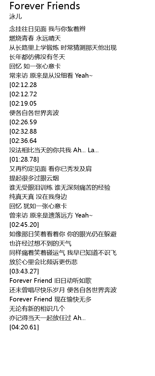 | [03:29.19][02:26.59][01:03.14] | Forever Friend xiàn zài yú kuài wú duō |