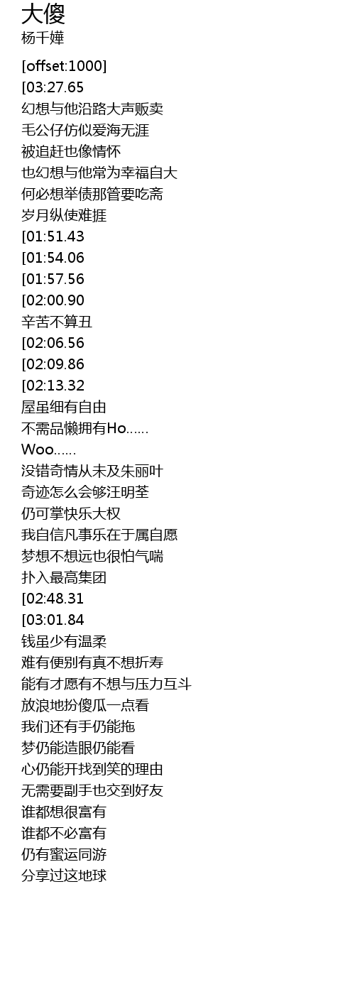 | [00:09.50][03:27.65] | 杨千�-大傻(粤) |
