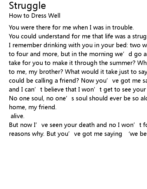| I remember drinking with you in your bed: two would’ve lead to three and three to four and more, but in the morning we’d go and start again! What would it take for you to make it through the summer? What would it take to bring you back to me, my brother? What would it take just to say you were something that I could be calling a friend? Now you’ve got me saying ‘we belong together’ and I can’t believe that I won’t get to see your face again. | |