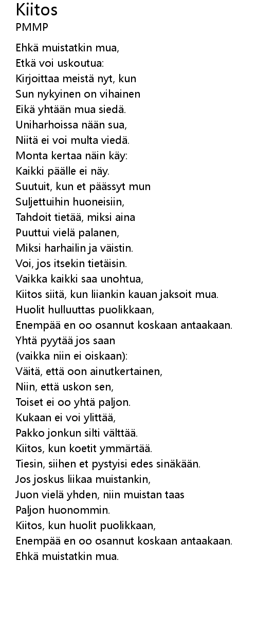 | Kiitos siitä, kun liiankin kauan jaksoit mua. | |
