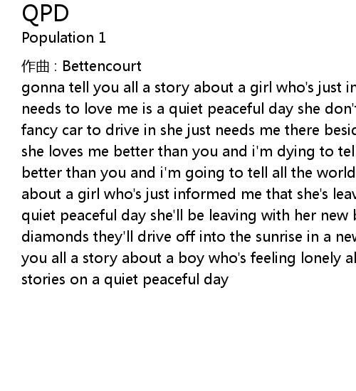 | gonna tell you all a story about a girl who' s just informed me that all she needs to love me is a quiet peaceful day she don' t need no shiny diamonds or a fancy car to drive in she just needs me there beside her on a quiet peaceful day she loves me better than you and i' m dying to tell all the world she loves me better than you and i' m going to tell all the world gonna tell you all a story about a girl who' s just informed me that she' s leaving me this morning it' s a quiet peaceful day she' ll be leaving with her new boy wearing brand new shiny diamonds they' ll drive off into the sunrise in a new mercedesbenz did i tell you all a story about a boy who' s feeling lonely always dreaming up these stories on a quiet peaceful day |