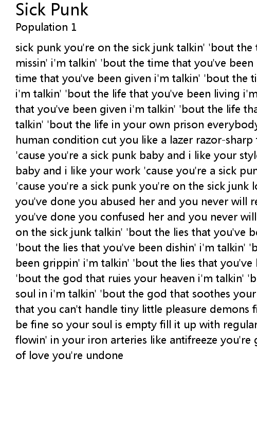 sick punk you're on the sick junk talkin' 'bout the time that you've been missin' i'm talkin' 'bout the time that you've been living i'm talkin' 'bout the time that you've been given i'm talkin' 'bout the time that you've been missin' i'm talkin' 'bout the life that you've been living i'm talkin' 'bout the life that you've been given i'm talkin' 'bout the life that you'll be killing i'm talkin' 'bout the life in your own prison everybody suffering is part of the human condition cut you like a lazer razor-sharp from head to toe numb you go 'cause you're a sick punk baby and i like your style 'cause you're a sick punk baby and i like your work 'cause you're a sick punk baby and i like your style 'cause you're a sick punk you're on the sick junk look at you now now look what you've done you abused her and you never will recover from it now look what you've done you confused her and you never will recover from it sick punk you're on the sick junk talkin' 'bout the lies that you've been livin' i'm talkin' 'bout the lies that you've been dishin' i'm talkin' 'bout the lies that you've been grippin' i'm talkin' 'bout the lies that you've been twistin' i'm talkin' 'bout the god that ruies your heaven i'm talkin' 'bout the god that sucks your soul in i'm talkin' 'bout the god that soothes your devil talkin' 'bout the god that you can't handle tiny little pleasure demons fighting for your mind you'll be fine so your soul is empty fill it up with regular it's popular feel it flowin' in your iron arteries like antifreeze you're good reminder off the agony of love you're undone
