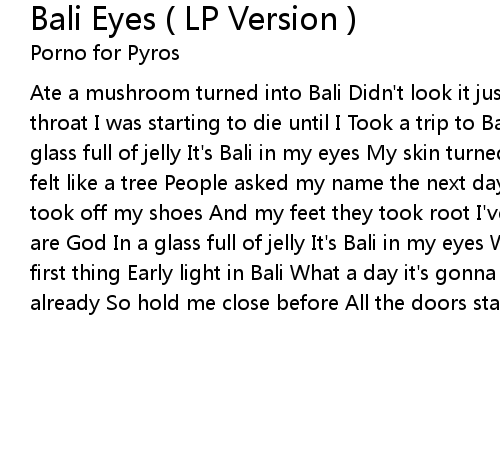 Ate a mushroom turned into Bali Didn't look it just jumped down my throat I was starting to die until I Took a trip to Bali Their eyes are God In a glass full of jelly It's Bali in my eyes My skin turned the color of the earth I felt like a tree People asked my name the next day They remembered who I was I took off my shoes And my feet they took root I've got Bali in my eyes Their eyes are God In a glass full of jelly It's Bali in my eyes When I opened up my eyes first thing Early light in Bali What a day it's gonna be I think It looks good already So hold me close before All the doors start knocking! Is Bali in my eyes |