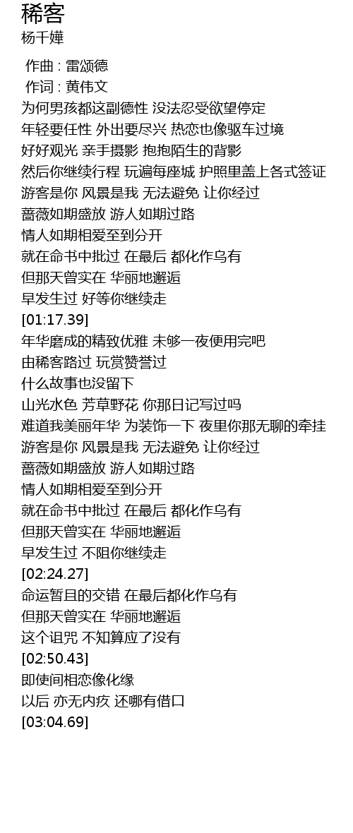 | [01:30.97] | 由稀客路过 玩赏赞誉过 |