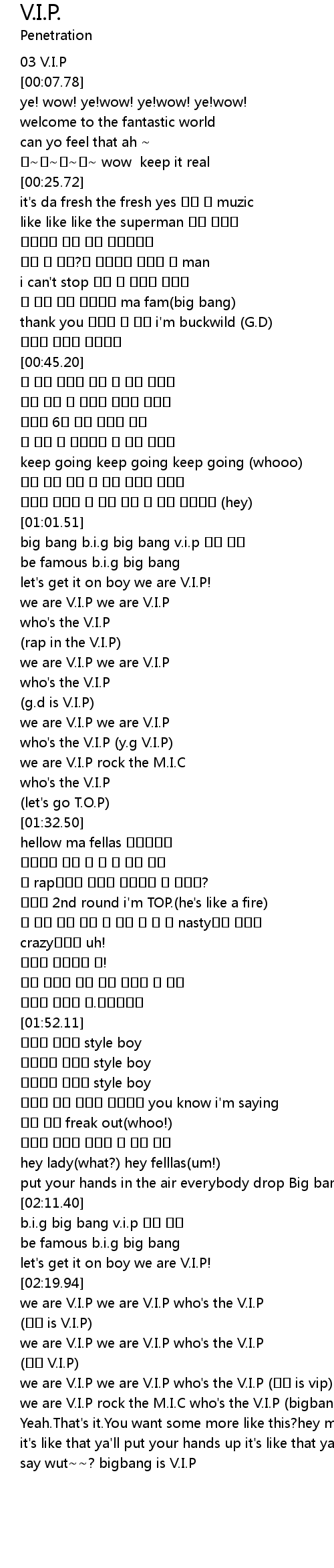 | [02:34.54] | we are V.I.P rock the M.I.C who's the V.I.P (bigbang is V.I.P) |