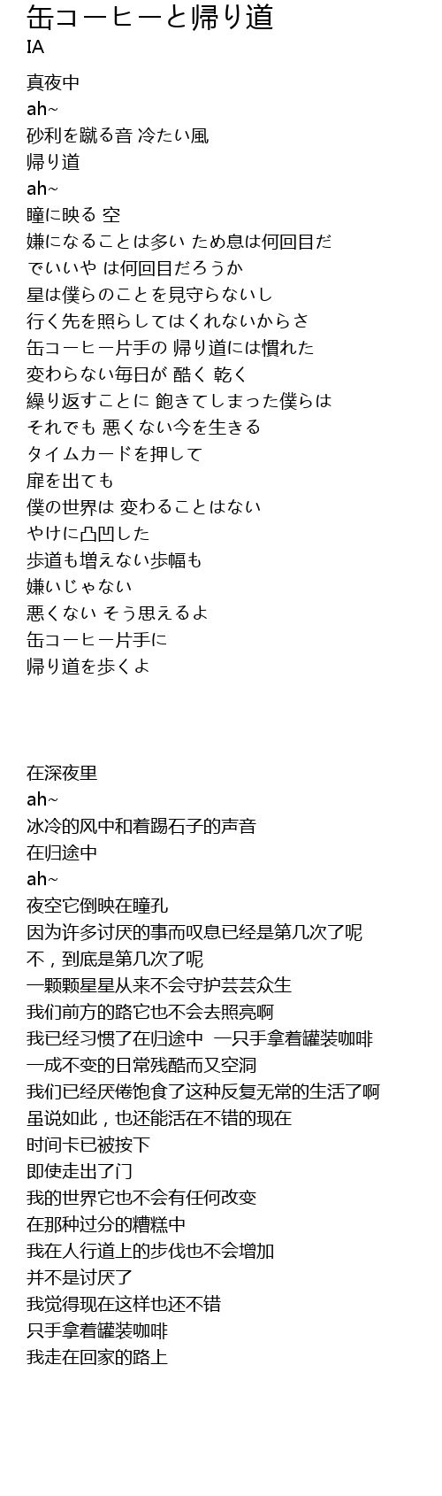 | [01:50.64] | 缶コーヒー片手の 帰り道には慣れた |