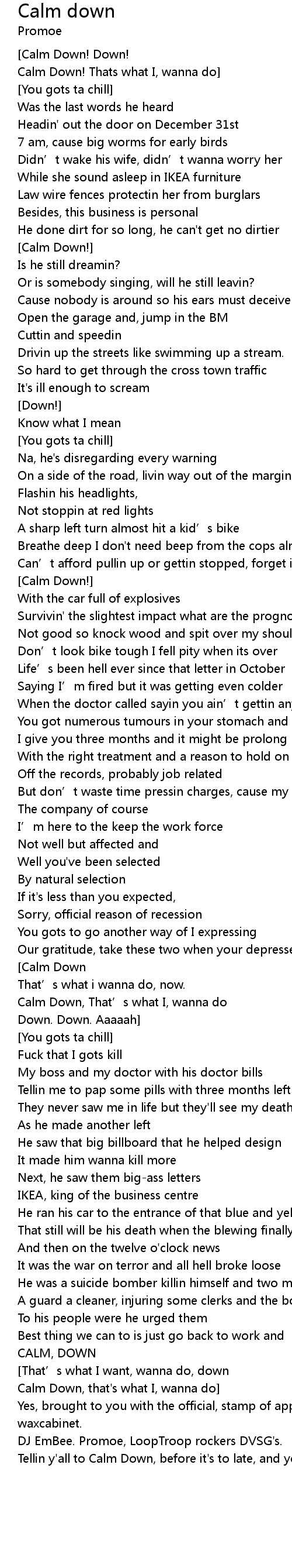 | Tellin y' all to Calm Down, before it' s to late, and you really calm down |