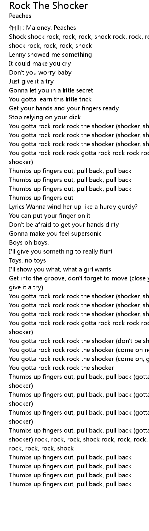 | Thumbs up fingers out, pull back, pull back gotta rock rock rock rock rock the shocker rock, rock, rock, shock rock, rock, rock, shock rock, rock, rock, shock rock, rock, rock, shock | |