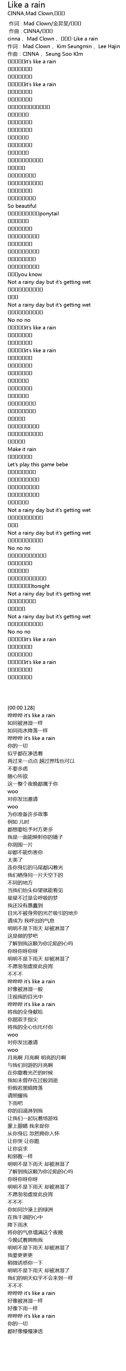 | [00:00.128] | cinna 、Mad Clown 、김승민-Like a rain |