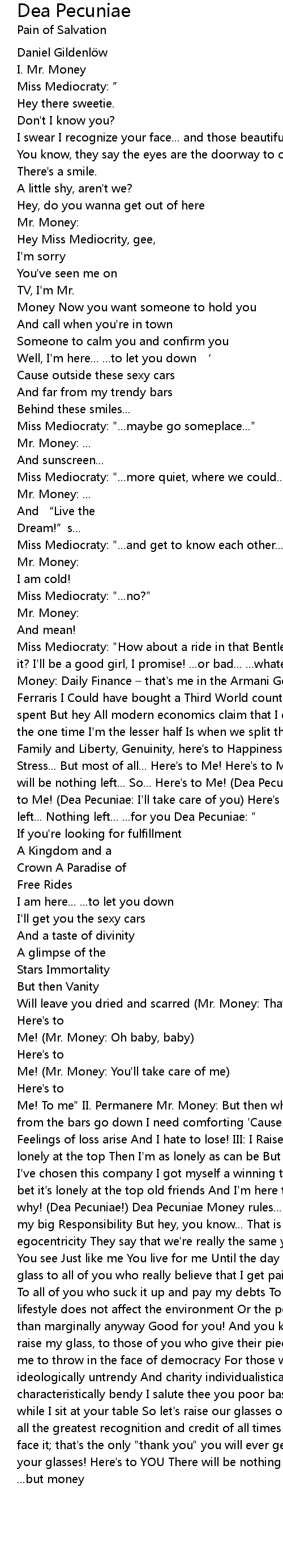 | Me! To me" II. Permanere Mr. Money: But then when it's silent And the lights from the bars go down I need comforting 'Cause somewhere there deep inside Feelings of loss arise And I hate to lose! III: I Raise My Glass They say it's lonely at the top Then I'm as lonely as can be But I am not too sorry You see, I've chosen this company I got myself a winning team It's Me, Myself and I You bet it's lonely at the top old friends And I'm here today to tell you suckers why! (Dea Pecuniae!) Dea Pecuniae Money rules... They claim that I get paid for my big Responsibility But hey, you know... That is just a lame excuse For my egocentricity They say that we're really the same you and I And I truly do agree You see Just like me You live for me Until the day you die And so I raise my glass to all of you who really believe that I get paid for my big responsibility To all of you who suck it up and pay my debts To all of you who think that my lifestyle does not affect the environment Or the poverty Well, maybe not more than marginally anyway Good for you! And you know what? Here's to you... And I raise my glass, to those of you who give their piece of the cake for free, for me to throw in the face of democracy For those who help making solidarity ideologically untrendy And charity individualistically idiotic, unsmart and characteristically bendy I salute thee you poor bastards 'cause you all nod while I sit at your table So let's raise our glasses one last time, to give you all the greatest recognition and credit of all times – cause after all, let's face it; that's the only "thank you" you will ever get So come on now - raise your glasses! Here's to YOU There will be nothing left - no! Nothing left... ...but money |
