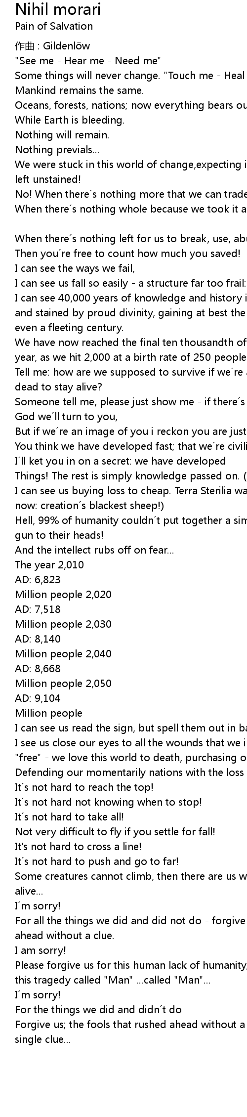 | Things! The rest is simply knowledge passed on. (I can see us drain this world, I can see us buying loss to cheap. Terra Sterilia washing its broken hand of us now: creation´s blackest sheep!) | |
