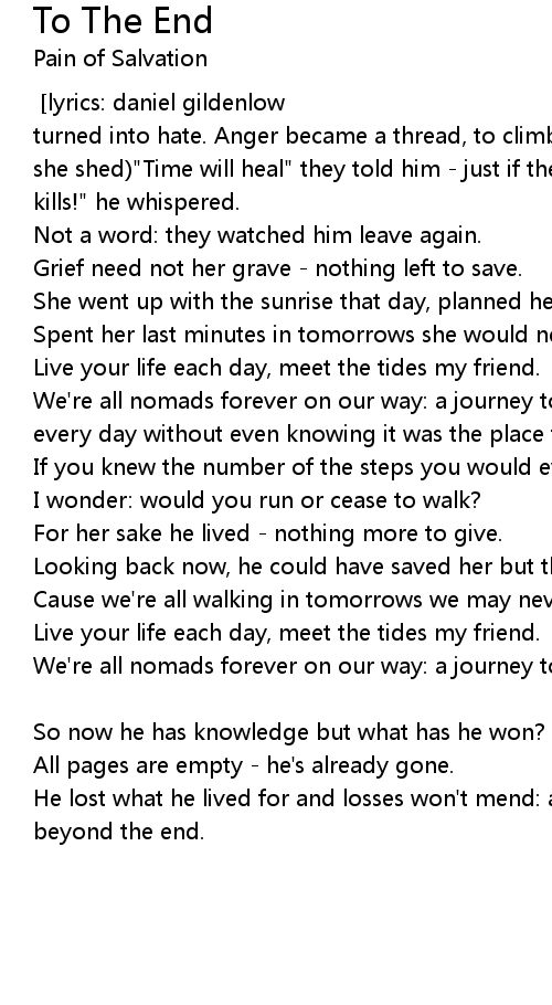 [music: daniel gildenlow/daniel magdic] [lyrics: daniel gildenlow] (Sorrow turned into hate. Anger became a thread, to climb with faith. Tasting the life she shed)"Time will heal" they told him - just if they knew his pain. "Time kills!" he whispered. |