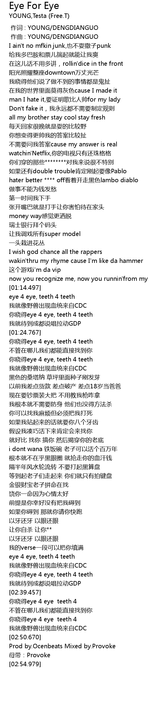 | [01:24.851] | 你晓得eye 4 eye, teeth 4 teeth |