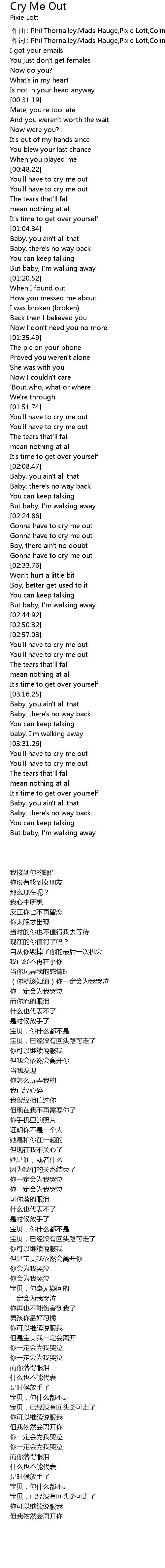 | 歌曲 | Cry Me Out |