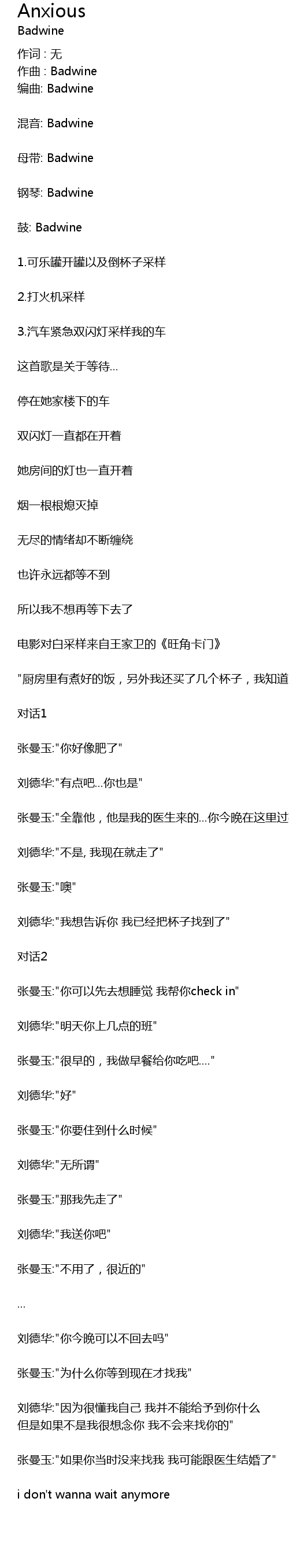 | 电影对白采样来自王家卫的《旺角卡门》 | |