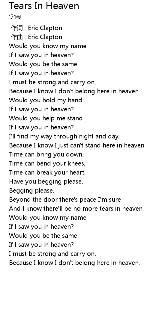 | [03:08.426] | And I know there' ll be no more tears in heaven. |