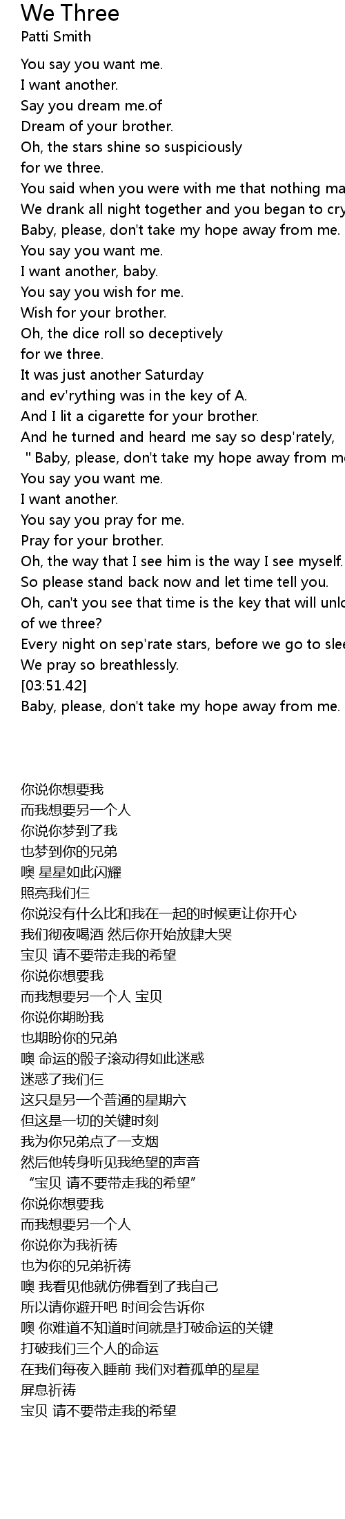 | [03:52.69] | Baby, please, don't take my hope away from me. |