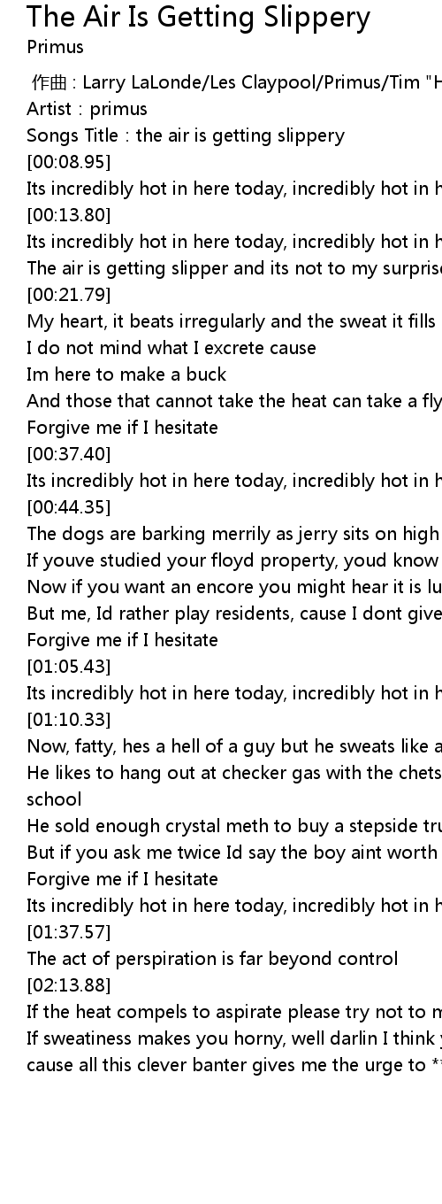 | [00:18.51] | The air is getting slipper and its not to my surprise |