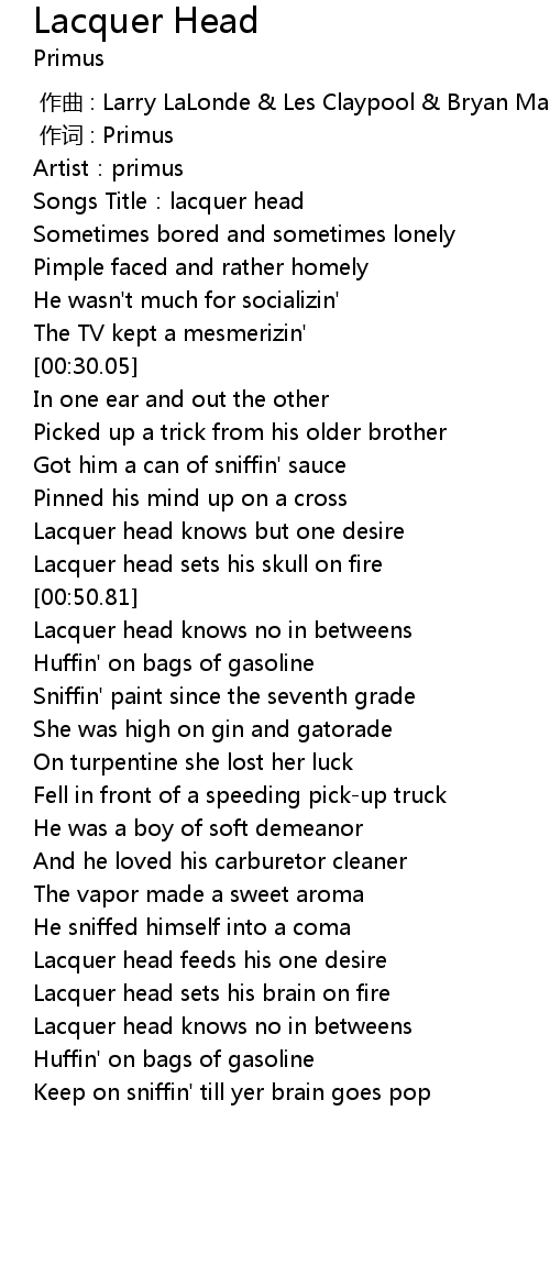 | [00:00.00] | 作曲 : Larry LaLonde & Les Claypool & Bryan Mantia |