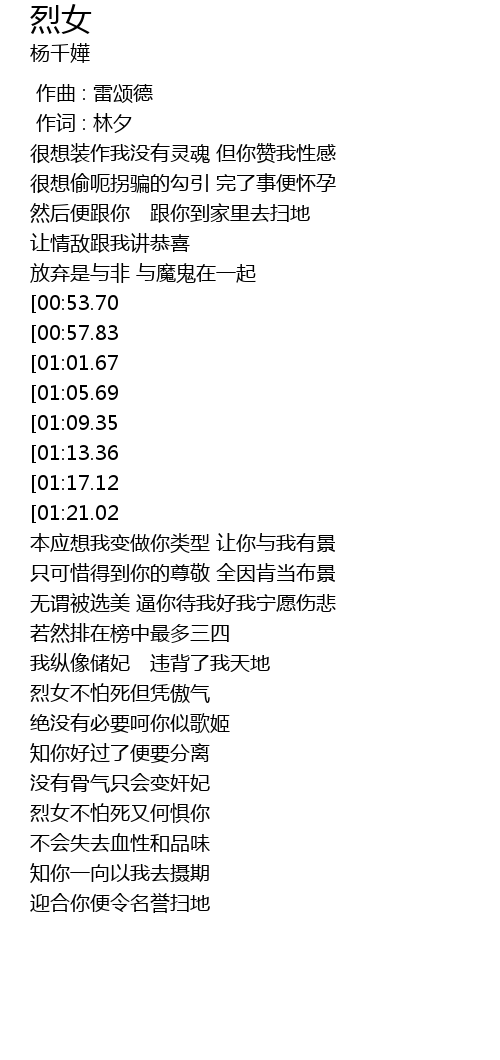 | [02:26.63][01:09.35] | 烈女不怕死又何惧你 |
