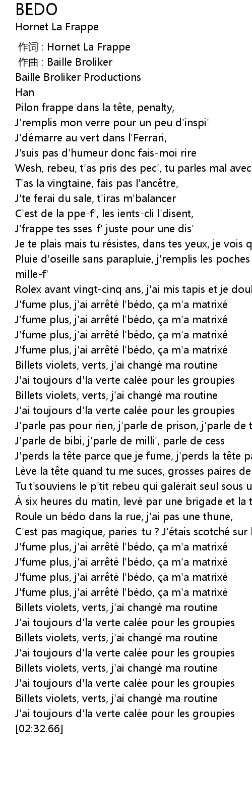 | [02:08.18] | J' ai toujours d' la verte calé e pour les groupies |