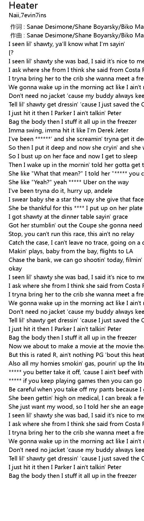 | [01:56.127] | But this is rated R, ain' t nothing PG ' bout this heater |