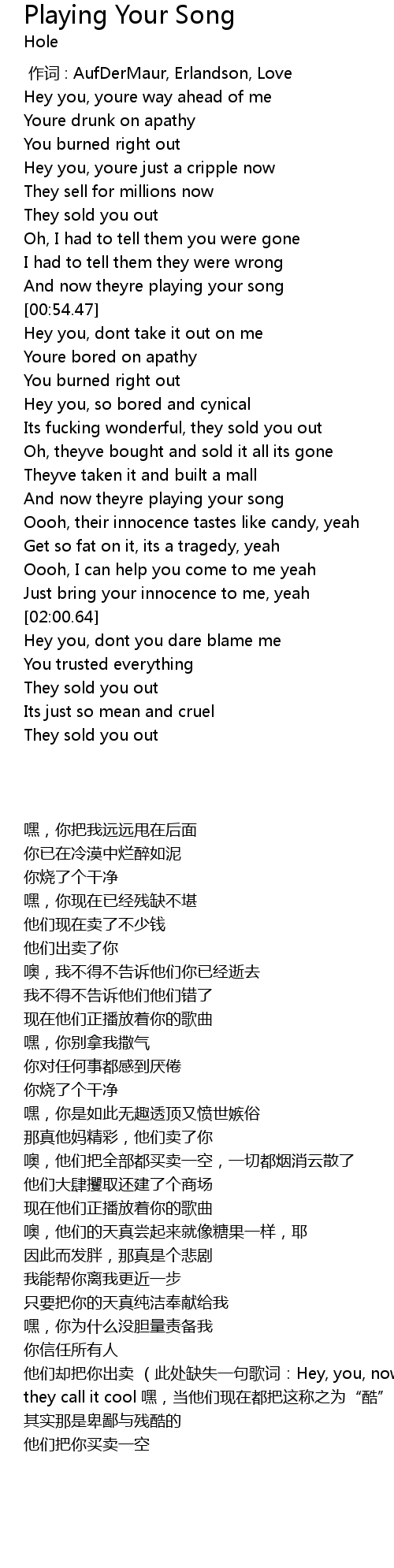 | [02:12.75] | 他们却把你出卖 (此处缺失一句歌词:Hey, you, now when they call it cool 嘿,当他们现在都把这称之为“酷”的时候) |