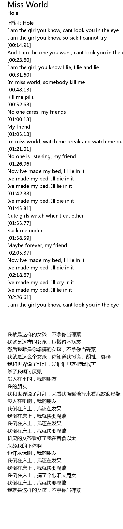 | [00:42.13] | Im miss world, somebody kill me |