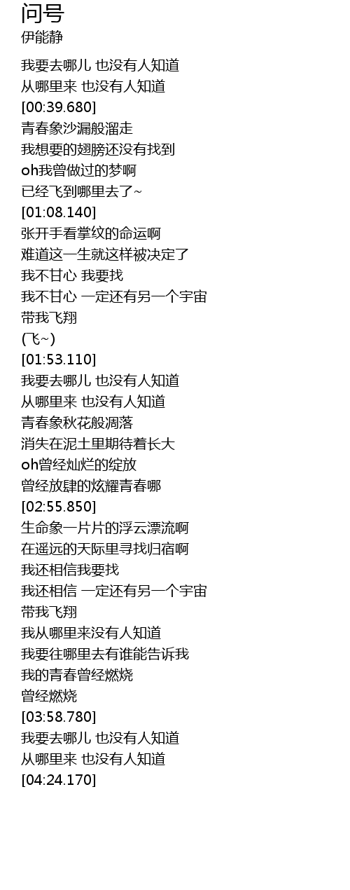 | [04:08.200] | wǒ yào qù nǎ ér yě méi yǒu rén zhī dào |