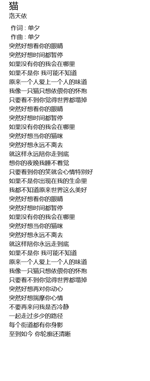 | [00:41.93] | 我像一只猫只想依偎你的怀抱 |