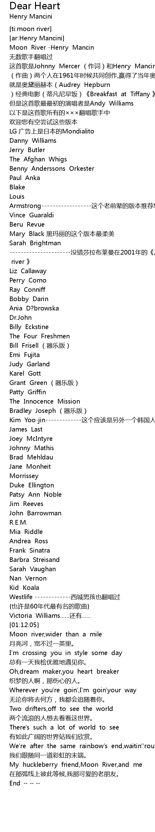 | [00:06.59] | 这首歌是Johnny Mercer (作词)和Henry Mancini (作曲)两个人在1961年时候共同创作,赢得了当年奥斯卡最佳电影原创歌曲奖 |