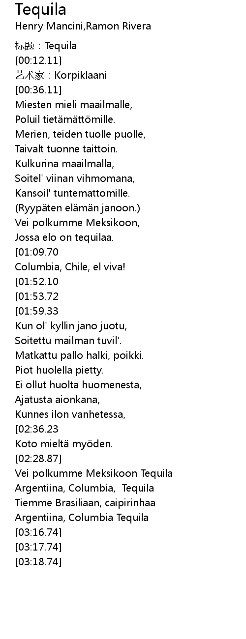 | [02:59.88] | Vei polkumme Meksikoon Tequila |