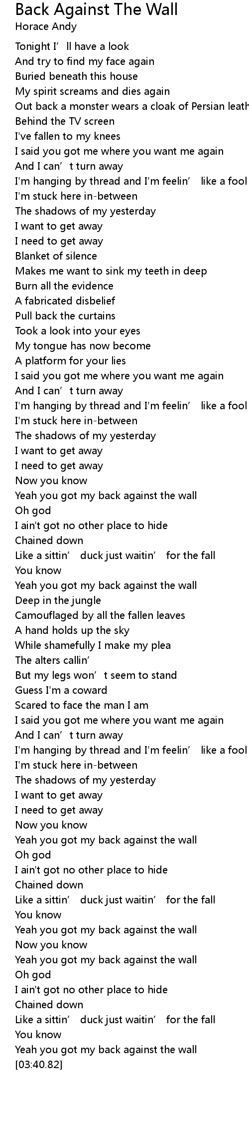 | [03:36.64] | Yeah you got my back against the wall |