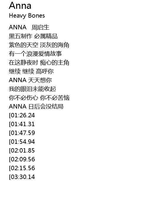 | [00:03.18] | ANNA zhōu qǐ shēng |
