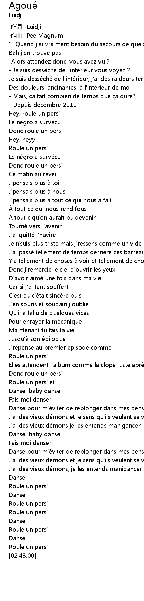| [02:06.54] | J' ai des vieux dé mons, je les entends manigancer |