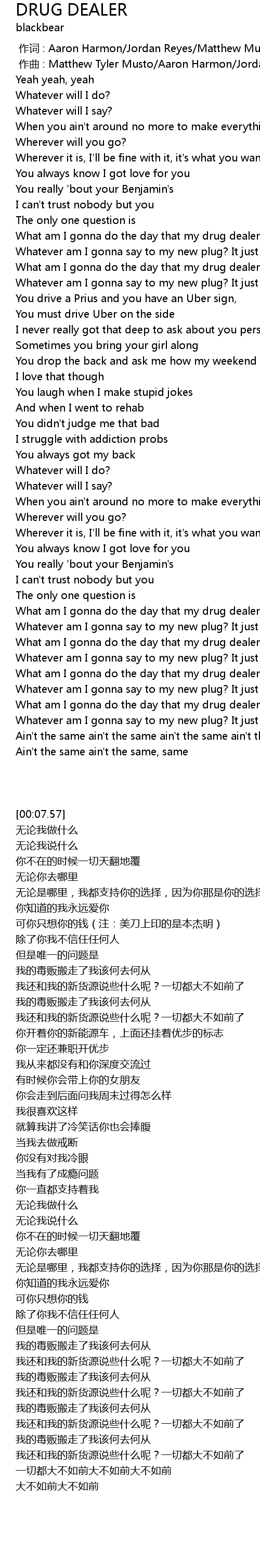 | [00:35.29] | What am I gonna do the day that my drug dealer moves away? |