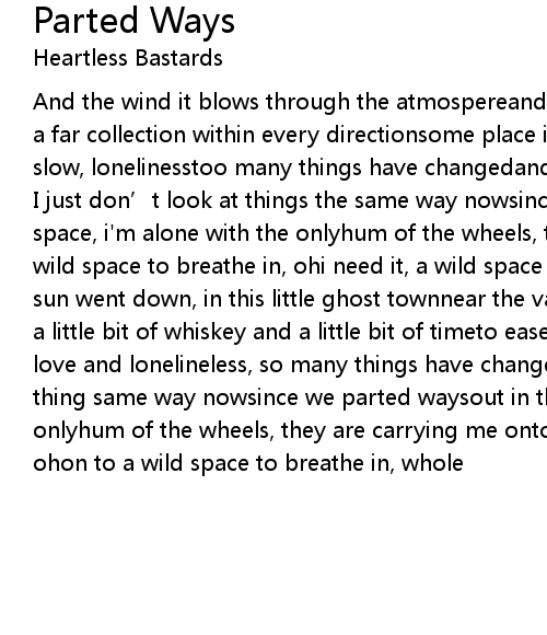 | I just don' t look at things the same way nowsince we parted waysout in the space, i' m alone with the onlyhum of the wheels, they are carrying me onto a wild space to breathe in, ohi need it, a wild space to breathe in, wholeand the sun went down, in this little ghost townnear the valley of the rio grandei need a little bit of whiskey and a little bit of timeto ease my troubled mindlost love and lonelineless, so many things have changeand no, i just don' t look at thing same way nowsince we parted waysout in the space, i' m alone with the onlyhum of the wheels, they are carrying me onto a wild space to breathe in, ohon to a wild space to breathe in, whole |