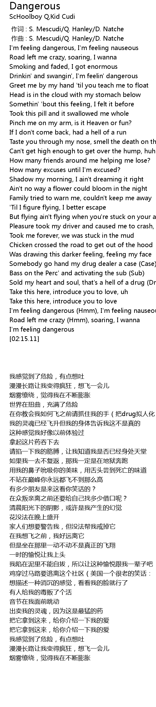 | [01:51.05] | I'm feeling dangerous (Hmm), I'm feeling nauseous |
