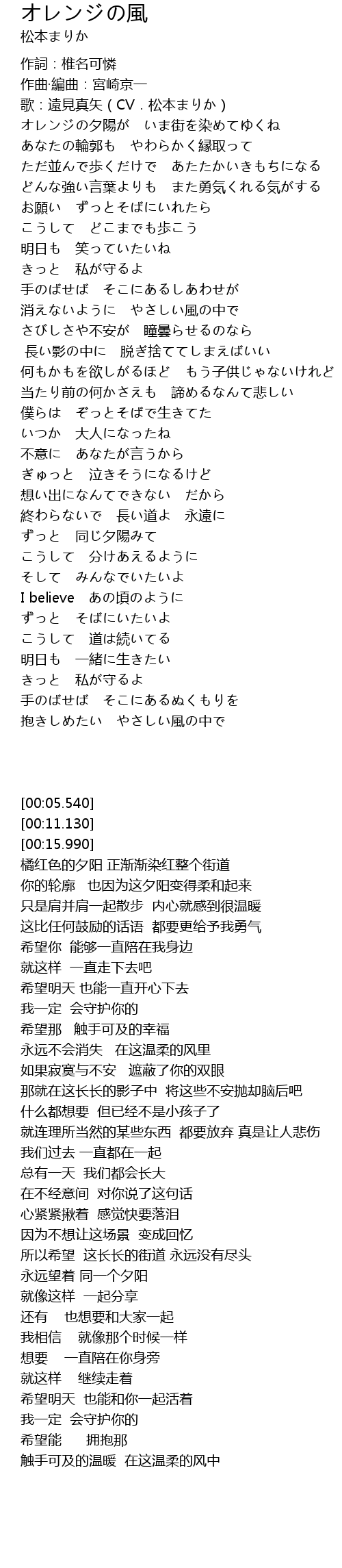 | [00:21.450] | オレンジの夕陽が いま街を染めてゆくね |