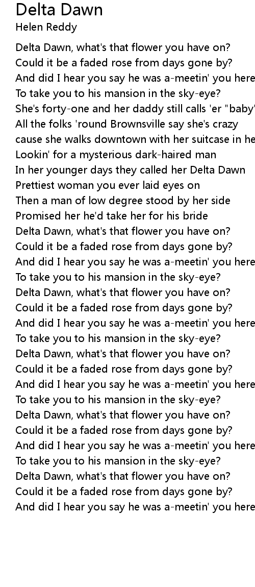 | [00:01.600] | Delta Dawn, what's that flower you have on? |