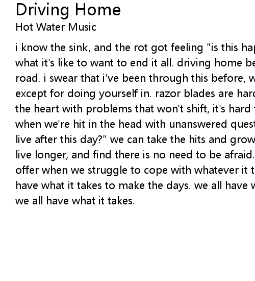 i know the sink, and the rot got feeling "is this happening to me?" and i know what it's like to want to end it all. driving home between the lines in the road. i swear that i've been through this before, when nothing makes much sense except for doing yourself in. razor blades are hard to hold. when we're hit in the heart with problems that won't shift, it's hard to admit that we are afraid when we're hit in the head with unanswered questions that repeat, "how could i live after this day?" we can take the hits and grow tougher collect ourselves to live longer, and find there is no need to be afraid. because we all have more to offer when we struggle to cope with whatever it takes to make the days. we all have what it takes to make the days. we all have what it takes to make it home. we all have what it takes.