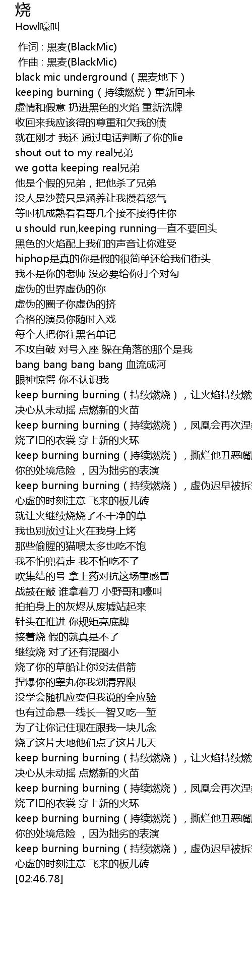 | [02:33.72] | keep burning burning(持续燃烧),撕烂他丑恶嘴脸 |