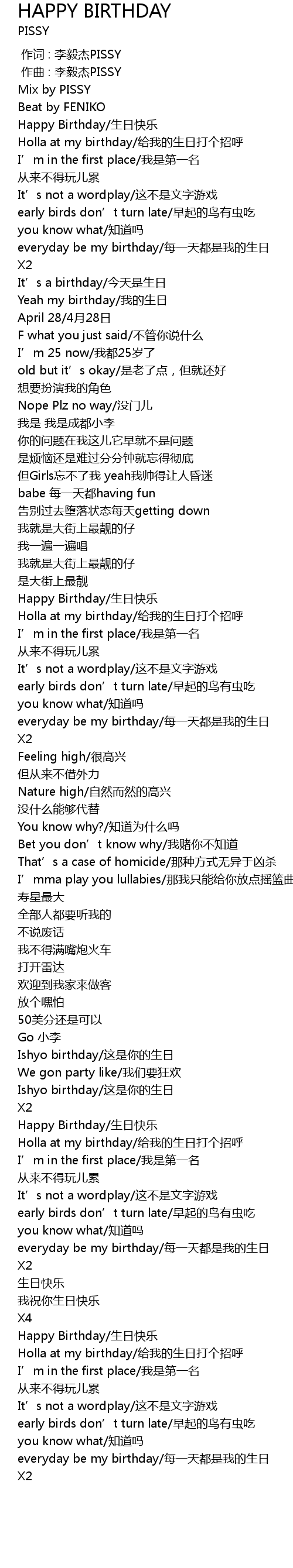 | [00:10.562] | Holla at my birthday gei wo de sheng ri da ge zhao hu |