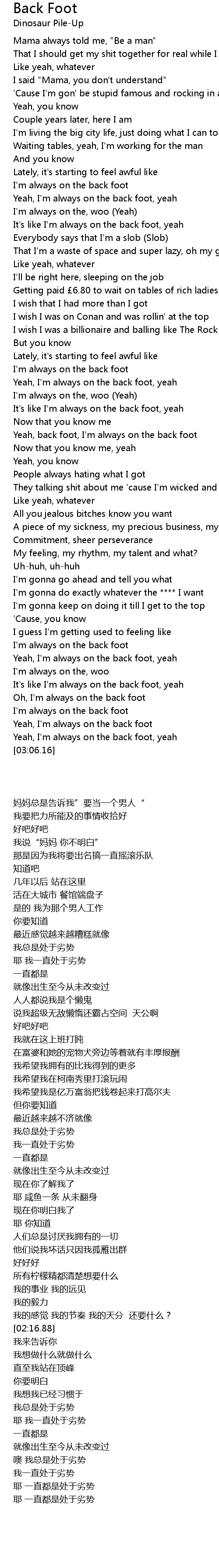| [03:02.00] | Yeah, I' m always on the back foot, yeah |