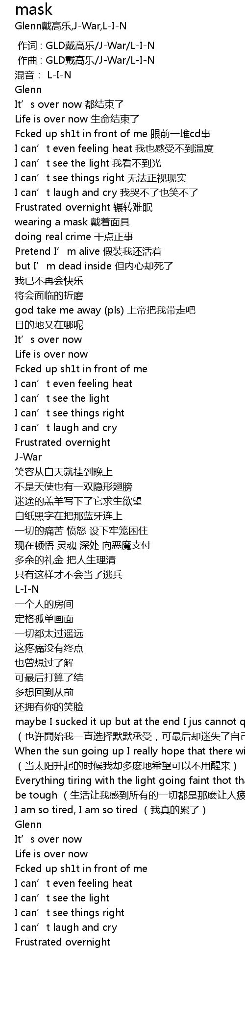 | [02:11.644] | maybe I sucked it up but at the end I jus cannot quit fckin up ye xu kai shi wo yi zhi xuan ze mo mo cheng shou, ke zui hou que mi shi le zi ji |