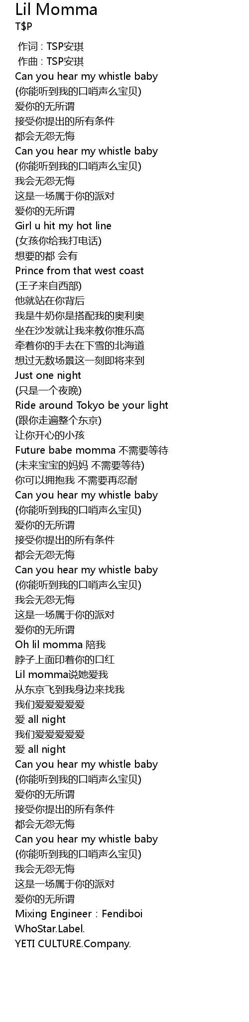 | [01:25.032] | Oh lil momma pei wo |